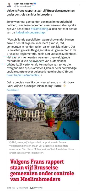 "Several specialists warn that within a few decades, several French municipalities will fall into the hands of islamists. This is already the case in Belgium, in at least five municipalities in the Brussels agglomeration, such as Saint-Josse and Molenbeek. These are municipalities where an overwhelming majority of the inhabitants are of foreign origin. They show the characteristics of zones that have been taken over, islamists seem to have almost complete social control over the population."