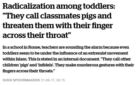 "In a school in Ronse, teachers are sounding the alarm because even toddlers seem to be under the influence of an extremist movement within Islam. This is stated in an internal document. "They call other children 'pigs' and 'infidels'. They make murderous gestures with their fingers across their throats.""